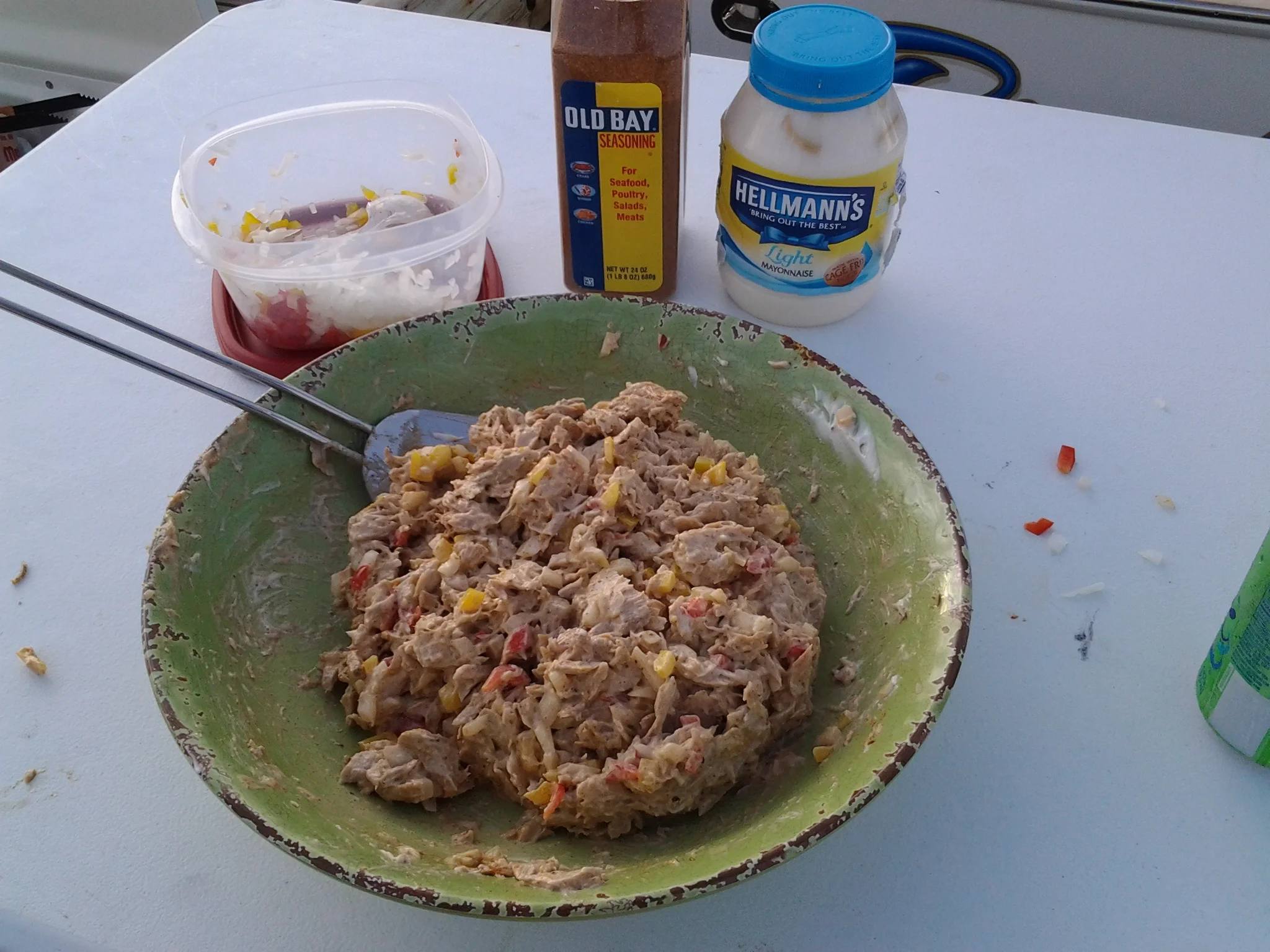 2. Make a pan out of foil ,double thick, and place rest of tuna sliced 1 inch thick on hot grill. Pour Old Bay liberally over it all. After 10 minutes flip fish over and add some more Old Bay to taste. When spatula can cut fish clean through it done. Use spatula to transfer directly to bowl.
