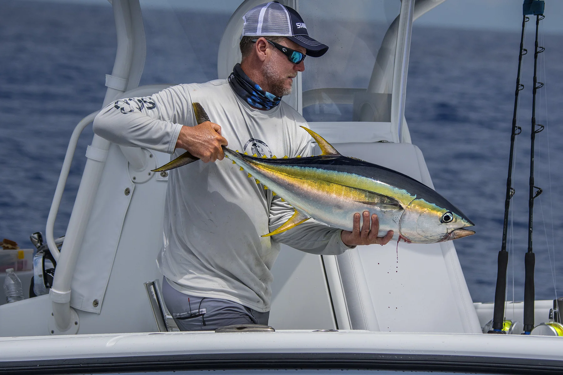 Scott and Steve head to the island of Bimini, where yellowfin tuna are most commonly found. Told by the locals, this type of tuna is easiest to catch early in the morning or later in the evening, so the guys head out to the water early. While out on the boat, Steve and Scott notice some birds gathering around, indicating tuna are near by. Casting their lines, Steve and Scott are able to catch quite a few yellowfin at first, but then notice the sharks have taken interest. This becomes an increasingly amount of effort to reel in the tuna before they are eaten by the sharks, making this fishing trip quite the adventure.