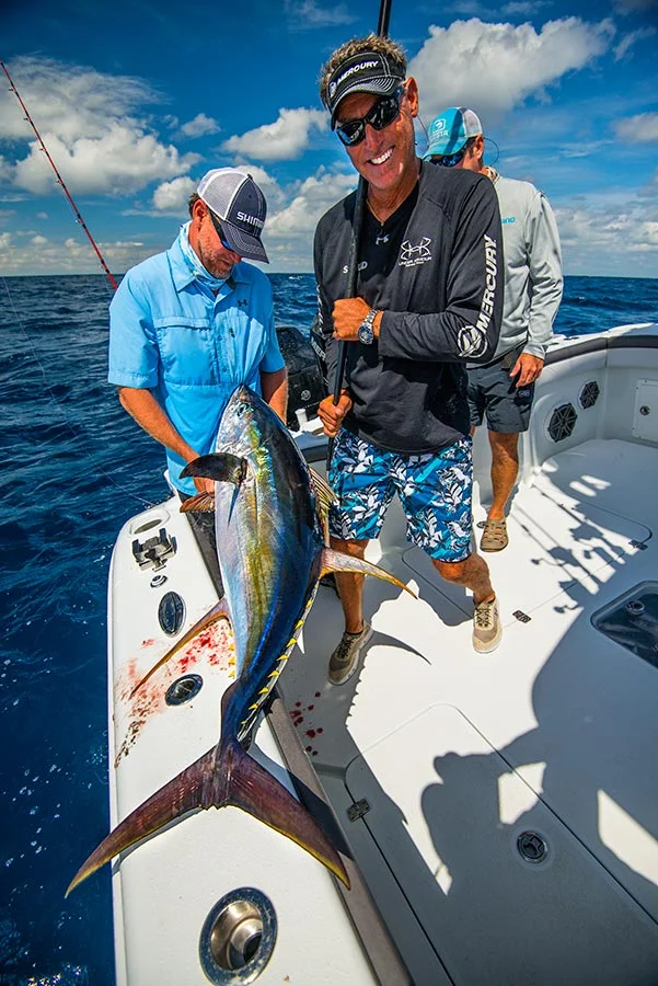 Now it was Steve’s turn. In the next half hour or so, they caught a few little tuna and worked through some sharks then Steve got a big bite. It became apparent quickly that he was locked into a pretty big yellowfin and that this might take a little while. After about a half hour, he got it to the surface, but with a cameraman in the water and the camera boat coming over for a shot, each time it came up, it would sound again. I was able to use the extended battle to my advantage to get some underwater shots of the tuna and a hammerhead that was investigating the activity. Eventually they brought the tuna on board and again we circled back to deploy more baits.